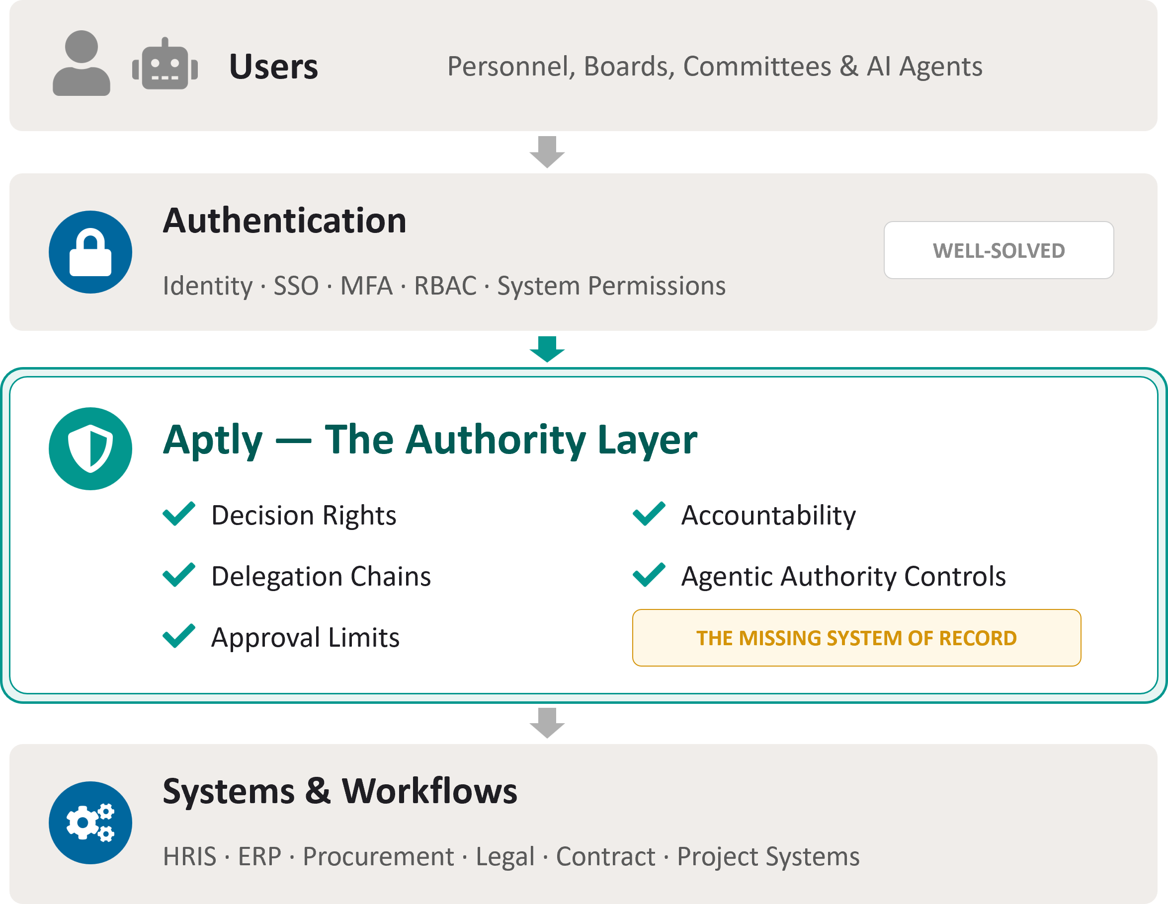 The authority layer for the enterprise. Aptly sits between identity management and business systems, providing the missing governance layer that defines who can approve, sign, and commit on behalf of the organization.
